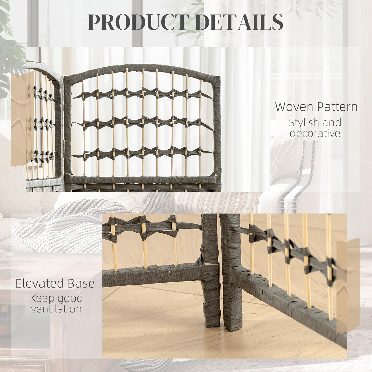 - Quality Material: Constructed of double side woven paper, a solid wood frame, and connecting metal hinges, this room separator is sturdy and smooth while allowing air circulation and light through.