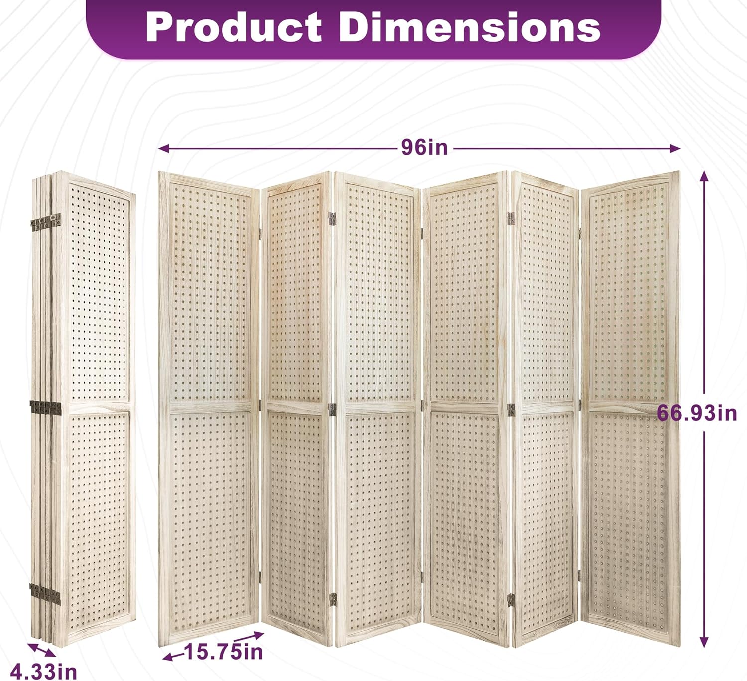 2 Pack Room Divider, 5.6FT Folding Room Divider Panel, 6 Panel Pegboard Display Wood Partition Wall Divider for Room Separation& Craft Shows, Natural Wood